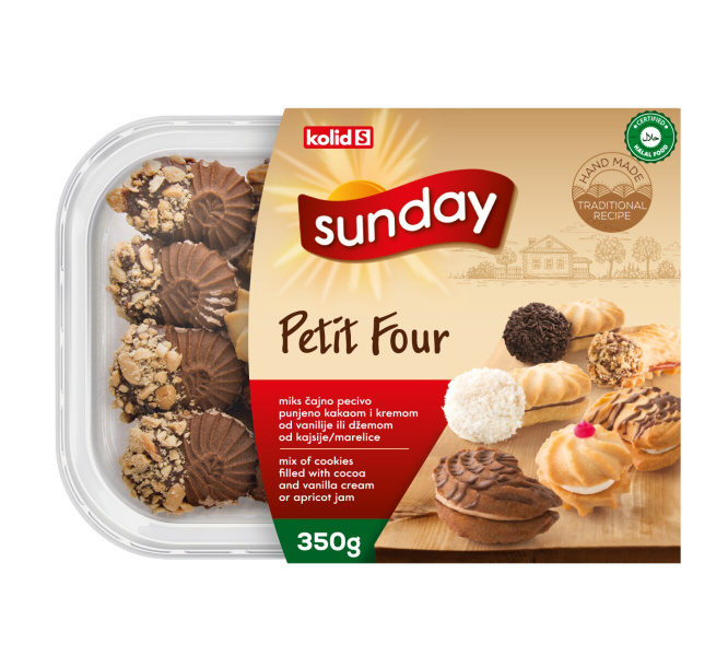 Pšenična moka, rastlinsko olje (sončnica, SOJA, koruza), rastlinska maščoba (palma, kokos), sladkor, marelični džem 9%((marelice, jabolka, sladkor, glukozni sirup, želirno sredstvo (pektin), sredstvo za uravnavanje kislosti (E330), konzervans (E202), aroma)), temna krema ((rastlinsko olje(SOJA), rastlinska maščoba (palma, kokos), sladkor, sirotke v prahu, kakav v prahu, sojina moka, modificiran koruzni škrob, aroma, konzervans (E202)), bela krema ((rastlinsko olje (SOJA, koruza), rastlinska maščoba (palma, kokos), sladkor, sirotke v prahu, sojina moka, modificiran koruzni škrob, vanilija, konzervans (E202)), mleko v prahu, ječmenov slad, kakavovi ostružki (palmovo olje, sladkor, kakav v prahu), beli obliv (palmova maščoba, sladkor, sojina moka), temen obliv (palmova maščoba, sladkor, kakav, sojina moka), emulgator(E322-soja), ARAŠIDI, kokos, kakav v prahu, okrasne perle(( voda, sladkor, glukozni sirup, sredstvo za uravnavanje kislosti(E330), modificiran škrob, konzervans(E202), barvilo(E120)) ,
