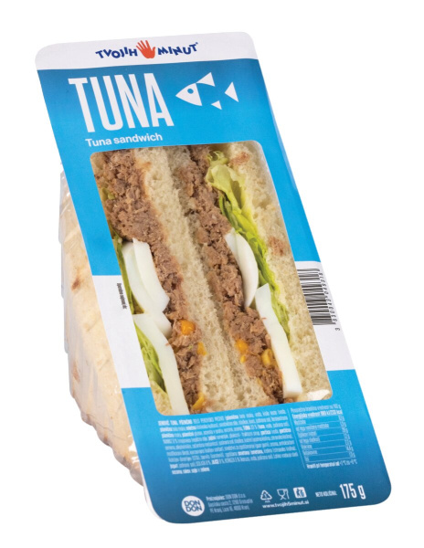 Sestavine: PŠENIČNO belo pekovsko pecivo (PŠENIČNA bela moka, voda, kislo testo (voda, PŠENIČNA bela moka, mlečno kislinska kultura)), sončnično olje, sladkor, kvas, jodirana sol, fermentirana PŠENIČNA moka, PŠENIČNI GLUTEN, acerola v prahu, encimi, aroma, TUNA 33% (TUNA, voda, jodirana sol), namaz 8 % (majoneza (repično olje, JAJČNI rumenjak, glukozni - fruktozni sirup, GORČICA (voda, GORČIČNA semena, alkoholni kis, začimbna mešanica), jodirana sol, sladkor, kislini (ocetna kislina, citronska kislina), modificirani škrob, konzervans (kalijev sorbat), sredstvo za zgoščevanje (guar gumi), aroma, antioksidant (kalcijev dinatrijev EDTA), barvilo (karoteni)), zgoščena SMETANA (SMETANA, kislina (citronska kislina), JOGURT, jodirana sol), solata 8%, JAJCE 8%, koruza 5% (koruza, voda, jodirana sol).
