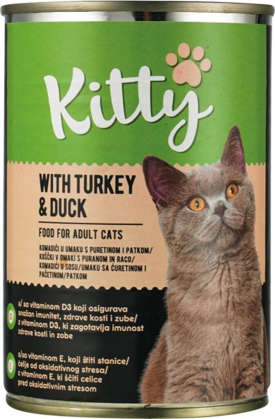 Hrana za mačke, s puranom in račko, Kitty, 405 g