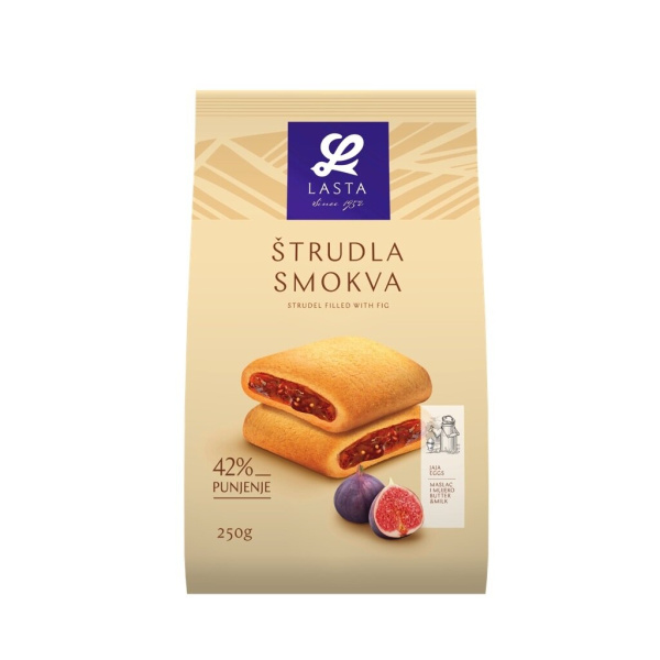 Figov nadev (figa 30 %, glukozno fruktozni sirup, sladkor, jabolčna kaša 3 %, gostilo pektin, regulator kislosti E330), PŠENIČNA moka, voda, rastlinska maščoba (palmovo olje), sladkor, glukozni sirup, MLEČNA maščoba, PŠENIČNI škrob, JAJCA , polnomastno MLEKO v prahu, posneto MLEKO v prahu, med, naravna aroma vanilije, vzhajalna sredstva (E 500, E 503), sol, konzervans kalijev sorbat E202. Lahko vsebuje LEŠNIKE in SOJO.