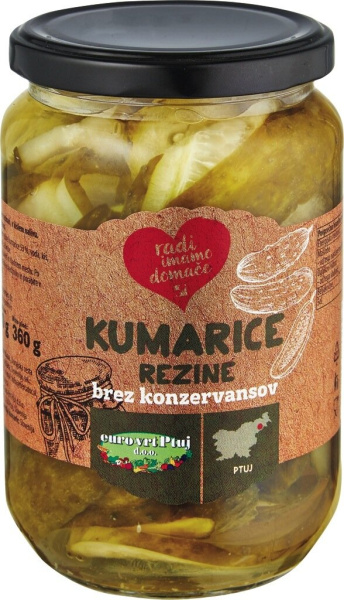 Kumarice rezane 53 %, voda, kis, sladkor, sol, začimbe.