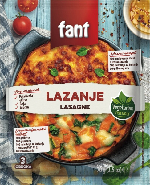 Mesni recept: Lazanja: 300 g mletega mesa, 8 listov lazanje, 100 ml smetane za kuhanje, 50 g naribanega sira, 3 žlice olja. Navodilo za uporabo: 1. 300 g mletega mesa prepražite na olivnem olju. Vsebino vrečke vmešajte v 600 ml vode in 100 ml smetanje ter prelijte čez meso. Kuhajte dokler ne zavre. 2. V pekač 20 cm x 20 cm položite liste testenin in prelijte s pripravljeno omako z mesom. To ponovite dvakrat (testenine, omaka). Na vrhu razporedite liste testenin, zalijte s preostalo omako in posujte z naribanim sirom. 3. V pečici, segreti na 180 °C, pecite približno 30 minut. Vegetarijanski recept: Zelenjavna Lazanja: 200 g korenja, 100 g špinače, 1 mozzarela (125 g), 3 žlice olivnega olja. Navodilo za uporabo: Korenje narežite na kocke ter prepražite na olivnem olju. Dodajte špinačo in kuhajte dokler ne zavre. Vsebino vrečke vmešajte v 600 ml mlačne vode in 100 ml smetane ter prelijte čez korenje in špinačo. Kuhajte ob neprestanem mešanju dokler ne zavre. V pekač položiteliste testenin in prelijte s pripravljeno omako. Postopek ponovite dvakrat (testenine, omaka). Na vrhu razporedite liste testenin, zalijte s preostalo omako in posujte z mozzarelo. V pečici, segreti, na 180 °C, pecite približno 30 minut. Nasvet: Mozzarelo lahko nadomestite z naribanim sirom.