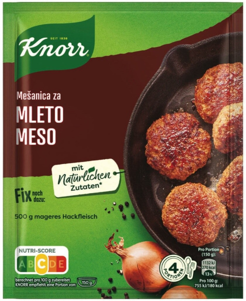 Priprava: Vsebino vrečke vmešajte v 100 ml mlačne vode. Dodajte 500 g mlete govedine in dobro premešajte. Oblikujte polpete ali mesno štruco. Polpetepopražite v ponvi z malo ulja na srednje močnemu ognju, 5 min na vsaki strani. Mesno štruco pecite v predhodno ogreti pečici cca 40 minut na 200°C (175°C ventilacijska pečica).