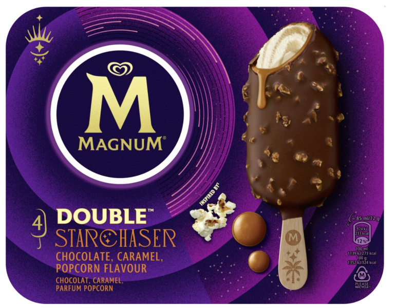 Sladoled na palčki, Double Starhaser, karamela in kokice, Magnum, 4 x 85 ml