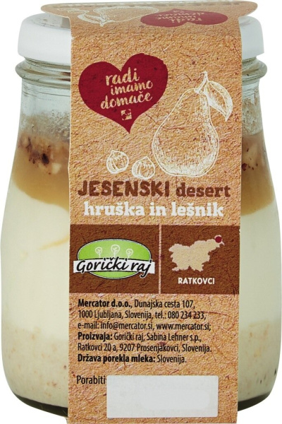 53% kremni JOGURT (polnomastno nehomogenizirano MLEKO, JOGURTOVE KULTURE), 23% pripravek PIRIN (PŠENIČNI) ZDROB (polnomastno mleko 88,8%, PIRIN (PŠENIČNI) ZDROB 8%, sladkor), 18% sadni pripravek hruška(70% hruške, sladkor), 6% karamelizirani LEŠNIKI ( 90% LEŠNIKI, sladkor).