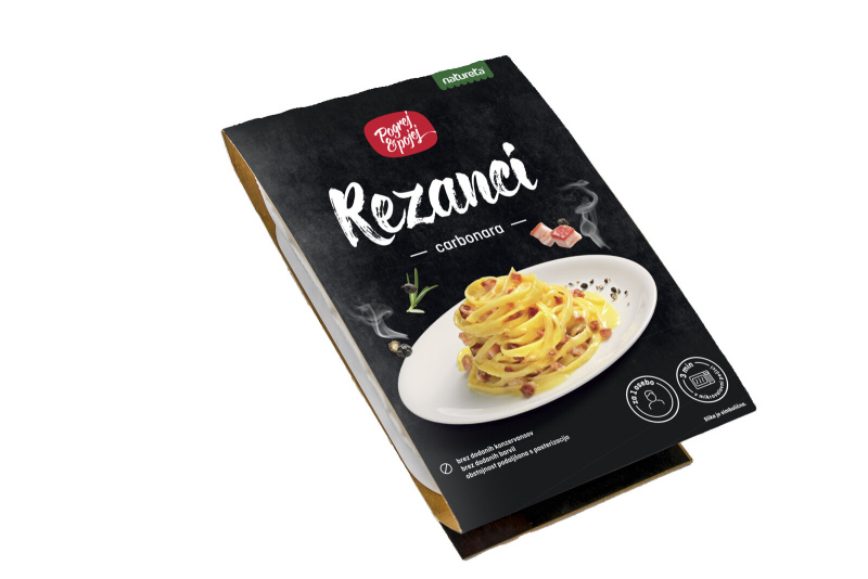 Omaka carbonara 56 % (voda, SMETANA 23 %, JAJČNI rumenjak, sončnično olje, naravne arome, SMETANA v prahu, sol, poper), kuhane testenine 40 % (PŠENIČNA durum moka, JAJCE, JAJČNI rumenjak, sol), kuhana slanina 4 % (svinjsko meso, voda, sol, arome, škrob, dekstroza, saharoza, aroma dima, antioksidanti: natrijev askorbat, regulator kislosti: natrijev citrat, natrijev acetat; stabilizatorji: difosfat in trifosfat; želirno sredstvo: karagenan, konzervans: natrijev nitrit).