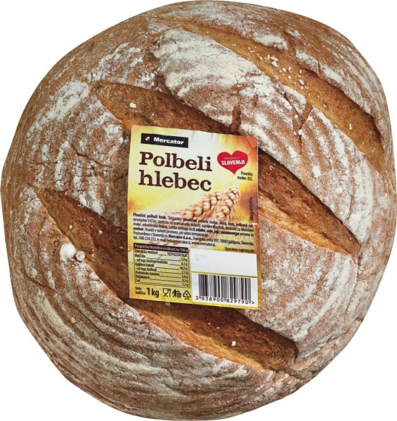 PŠENIČNA polbela moka, voda, kvas, jodirana sol, emulgator E472e, sredstvo za uravnavanje kislosti natrijev diacetat, sredstvo za obdelavo moke askorbinska kislina.