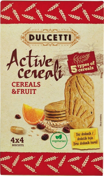 PŠENIČNA moka, žitarice 20 % (polnozrnata PŠENIČNA moka, OVSENI kosmiči, PŠENIČNI kosmiči, JEČMENOVI kosmiči, polnozrnata RŽENA moka, polnozrnata PŠENIČNA PIRINA moka) sladkor, palmina maščoba, rozine 4,3 %, posneto MLEKO v prahu, sredstvi za vzhajanje: amonijevi karbonati in natrijevi karbonati; jodirana sol, emulgator SOJIN lecitin, pomoranča v prahu 0,1 %, maltodekstrin, aroma. Lahko vsebuje ARAŠIDE, OREŠČKE in ŽVEPLOV DIOKSID.