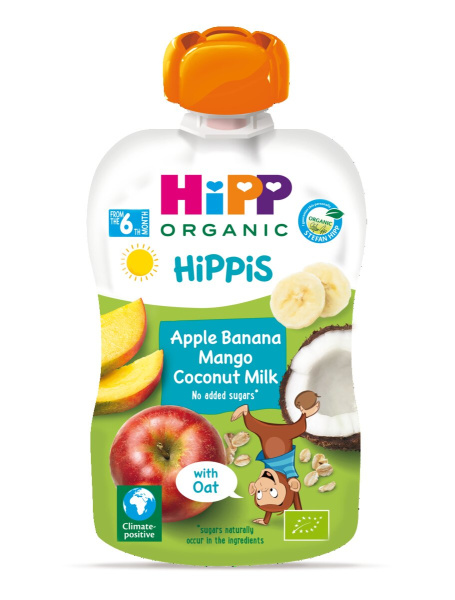 Sadje* 75 % (jabolka* 60 %, banane* 8 %, mango* 7 %), voda, pripravek iz kokosa* 9 %, polnovredna OVSENA moka* 4 %. *iz kontrolirane ekološke pridelave.