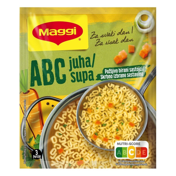 Testenine 65,9% (PŠENIČNA moka, JAJCA v prahu), jodirana sol 11,6% (sol, kalijev jodid), posušena zelenjava (čebula 2,5%, korenček 2,4%), koruzni škrob, krompirjev škrob, sladkor, izvleček kvasa, sončnično olje, začimbe, naravne arome, kislina: citronska kislina. Lahko vsebuje: MLEKO, ZELENO in SOJO.