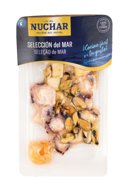 ORJAŠKI LIGENJ (Dosidicus gigas) 68 %, KLAPAVICE (Mytilus galloprovincialis) 20 %, KOZICE (Penaeus vannamei) 10 % - VSEBUJE konzervans: natrijev METABISULFIT, rastlinska olja (oljčno in sončnično), rižev škrob, sol, MLEČNE beljakovine, stabilizatorja: karagenan in natrijev karbonat, antioksidanta: natrijev askorbat in natrijev citrat. VSEBUJE: MEHKUŽCE, RAKE, LAKTOZO, SULFITE. V sledovih lahko vsebuje RIBE. Poreklo morskih sadežev: ORJAŠKI LIGENJ: ULOVLJENO v FAO 87, KOZICE: GOJENO v Ekvadorju, KLAPAVICE: GOJENO v Španiji.