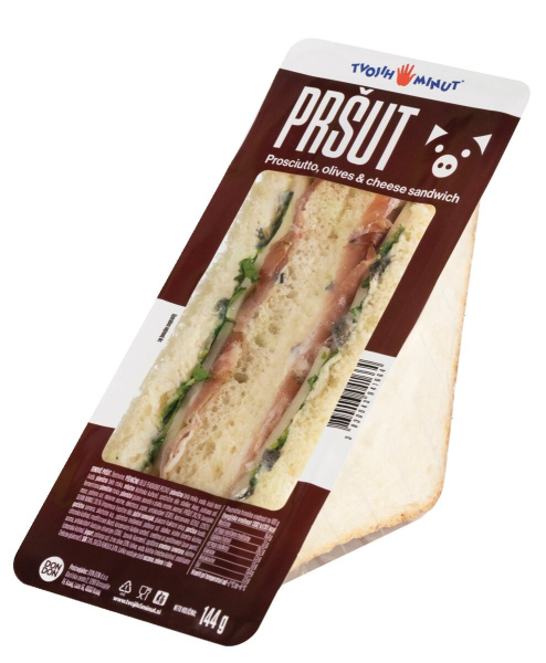 PŠENIČNO belo pekovsko pecivo (PŠENIČNA bela moka, voda, kislo testo (voda, PŠENIČNA bela moka, mlečno kislinska kultura), sončnično olje, sladkor, kvas, jodirana sol, fermentirana PŠENIČNA moka, PŠENIČNI gluten, acerola v prahu, encimi, aroma), pršut 24,2 % (svinjsko meso, jodirana sol, naravne arome, dekstroza, poper, antioksidant (E301), konzervans (E250, E252)), olivni namaz 20,1 % (majoneza (repično olje, JAJČNI rumenjak, glukozni-fruktozni sirup, gorčica (voda, GORČIČNA SEMENA, alkoholni kis, začimbna mešanica), jodirana sol, sladkor, kislini (ocetna kislina, citronska kislina), modificirani škrob, konzervans (kalijev sorbat), sredstvo za zgoščevanje (guar gumi), aroma, antioksidant (kalcijev dinatrijev EDTA), barvilo (karoteni), zgoščena SMETANA (SMETANA, kislina (citronska kislina), jogurt, jodirana sol, črne olive 20 % (olive, voda, kislina (mlečna kislina), stabilizator (železov glukonat)), SIR 7,4 %, sveža rukula 3,4 %.