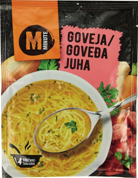 Testenine 66 % (PŠENIČNI zdrob, voda, jodirana sol (sol, kalijev jodat)), jušni koncentrat 34 % (jodirana sol (sol, kalijev jodat), maltodekstrin, ojačevalci arome: mononatrijev glutamat in dinatrijevi 5'-ribonukleotidi, posušena zelenjava v spremenljivem deležu 10,1 % (čebula, korenje, pastinak), palmina maščoba, koruzni škrob, hidrolizat SOJINIH beljakovin, goveji mesni ekstrakt 2 %, začimbe (list peteršilja 1,3 % in poper), goveja aroma, kislina: citronska kislina, barvili: riboflavin,karamel). Lahko vsebuje sledi MLEKA, JAJC in ZELENE.