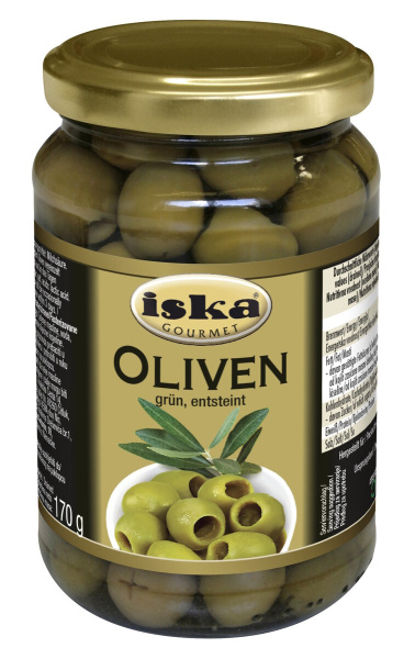 Zelene olive, voda, sol, kisline: mlečna kislina, citronska kislina, antioksidant: askorbinska kislina. Kljub največji pazljivosti med pridelavo, izkoščičene olive lahko občasno še vedno vsebujeno koščico.