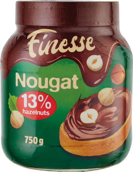 Sladkor, rastlinsko olje (palmino), LEŠNIKI 13 %, manj masten kakavov prah 7 %, SIROTKA v prahu, posneto MLEKO v prahu, rastlinska maščoba (palmina, shea), emulgator: lecitin (sončnični); aroma. Lahko vsebuje sledi drugih OREŠKOV, ARAŠIDOV in SOJE.