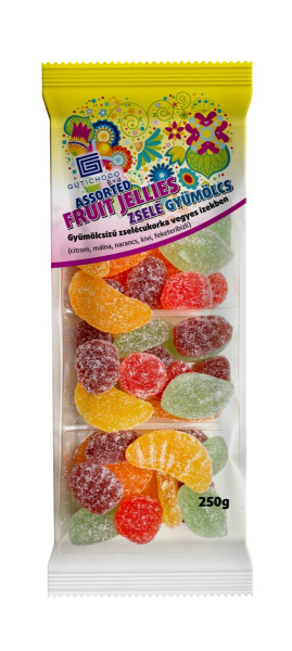 sladkor, glukozni sirup, želirno sredstvo: pektin; kislina: citronska kislina; sredstvo za uravnavanje kislosti: natrijev bikarbonat, jabolčna kislina; arome, barvila: karmin, izvleček paprike, kurkumin, bakrov klorofilin. Izdelek lahko vsebuje OREŠKE, ARAŠIDE, MLEKO in JAJCA.