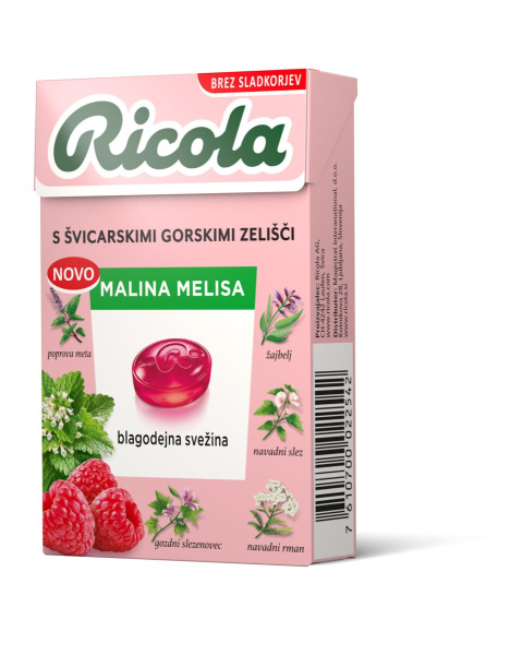 Sladilo (izomalt), kislini (citronska kislina, jabolčna kislina), zgoščen malinin sok (0,6%), izvlečki (0,5%) melise in Ricola mešanice 13 zelišč, naravne arome, koncentrat (sladki krompir, korenje), sladilo (steviol glikozidi iz stevije), olje poprove mete, metino olje, mentol.Prekomerno uživanje ima lahko odvajalni učinek.Naravno brez glutena in brez laktoze.Primerno za vegetarijance in vegane.