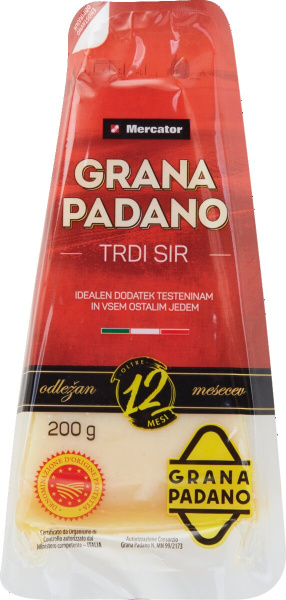 Trdi sir Grana Padano, zorjen 12 mesecev, Mercator, ZOP, pakirano, 200 g