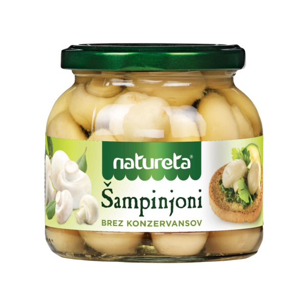 Šampinjoni, voda, vinski kis, jodirana sol, kislina: citronska kislina, začimbe.