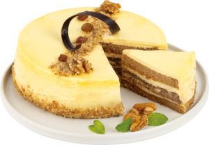 SMETANA sladka, sladkor, voda, OREHI, rozine, MLEKO, aroma (rum), glukozni sirup, PŠENIČNA moka, JAJČNI rumenjak, polnomastno kondenzirano MLEKO, sončnično olje, PŠENIČNI škrob, želatina, JAJČNI beljak v prahu, limonin sok, pražen JEČMEN, pražen koren cikorije, kava, emulgatorji (E472b, E477, E471, E475), sredstvi za vzhajanje (E450, E500), limonina lupinica, cimet, antioksidant (askorbinska kislina), naravna aroma (vanilija), sol, stabilizatorja (E415, E466), začimbe, barvilo (E150a). Lahko vsebuje sledi SOJE, MANDLJEV, LEŠNIKOV in ARAŠIDOV.