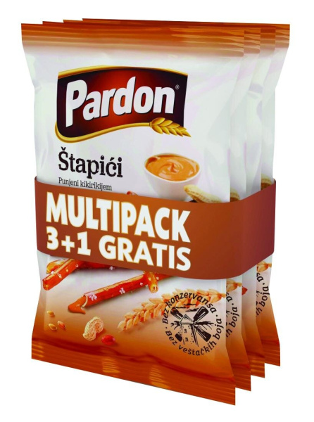 PŠENIČNA moka min. 60 %, ARAŠIDOVA pasta min. 22 % (ARAŠIDI, dekstroza), palmovo olje, koruzni škrob, jedilna sol max. 4 %, sirup iz invertnega sladkorja, maltodekstrin, emulgatorji (mono in digliceridi maščobnih kislin), sladkor, kvas. Lahko vsebuje SOJO.