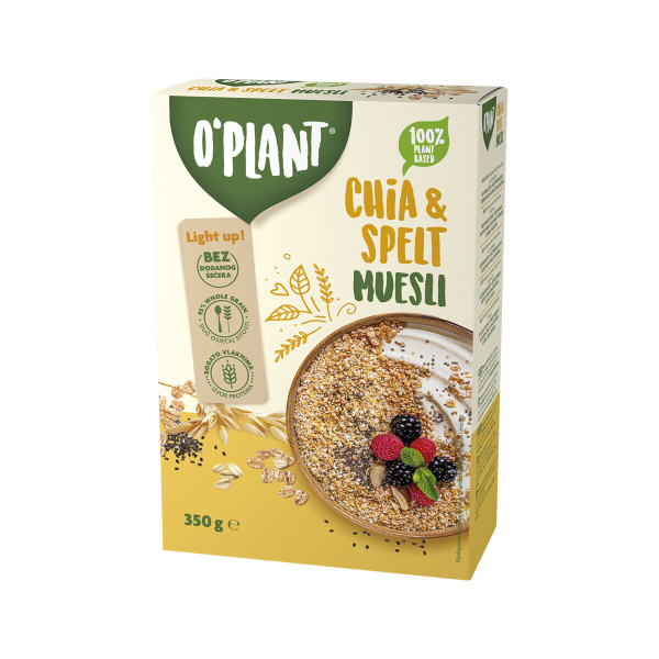 OVSENI polnozrnati kosmiči, drobni (75%), PŠENIČNI PIRINI polnozrnati kosmiči, drobni (20%), chia semena (semena oljne kadulje) (5%). Vsebuje GLUTEN. Lahko vsebuje LEŠNIKE, MLEKO in SOJO.