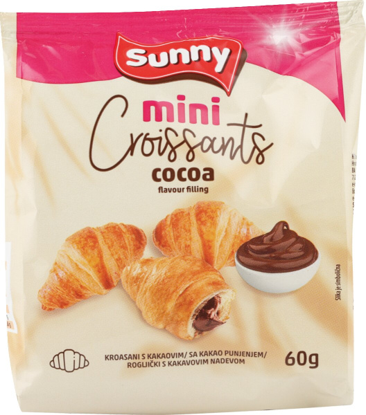 PŠENIČNA moka, kakavov nadev 23 % (sladkor, deloma hidrogenirana rastlinska olja (sončnično in palmino), voda, manj masten kakavov prah, emulgator: lecitini (SOJA), aroma LEŠNIKA in vanilije); margarina (deloma hidrogenirana rastlinska olja (sončnično in palmino), voda, jodirana sol (sol, kalijev jodat), emulgator: mono- in digliceridi mašlobnih kislin; sredstvo za uravnavanje kislosti: citronska kislina; aroma, konzervans: kalijev sorbat), sladkor, glukoza, JAJCA v prahu 1,7 %, kvas, jodirana sol (sol, kalijev jodat), emulgator: lecitini (SOJA); SOJINA moka, konzervans: kalcijev propionat in kalijev sorbat. Lahko vsebuje sledi drugih OREŠKOV.