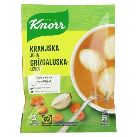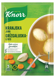 zdrobovi žličniki 63% [PŠENIČNI zdrob, palmina maščoba, LAKTOZA, BELJAK v prahu, RUMENJAK v prahu, jodirana sol (sol, kalijev jodid), ojačevalec arome (mononatrijev glutamat), sredstvo za vzhajanje (dinatrijev difosfat, natrijev karbonat), muškatni orešček], jodirana sol (sol, kalijev jodid), ojačevalec arome (mononatrijev glutamat, natrijev 5'-ribonukleotid), palmina maščoba, škrob, maltodekstrin, sladkor, čebula 1,3%, korenje 0,7%, izvleček kvasa, karamela, paradižnik, sol, kislina (citronska kislina), začimbe (kurkuma, muškatni orešček, poper), zelišča (peteršilj, drobnjak), naravna aroma (vsebuje ZELENO), por, česen