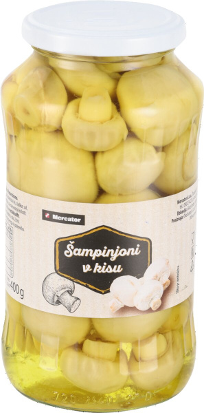 Šampinjoni 59 %, voda, alkoholni kis, sladkor, sol, začimbe, GORČIČNO semene, sredstvo za uravnavanje kislosti: citronska kislina; antioksidant: natrijev METABISULFIT.