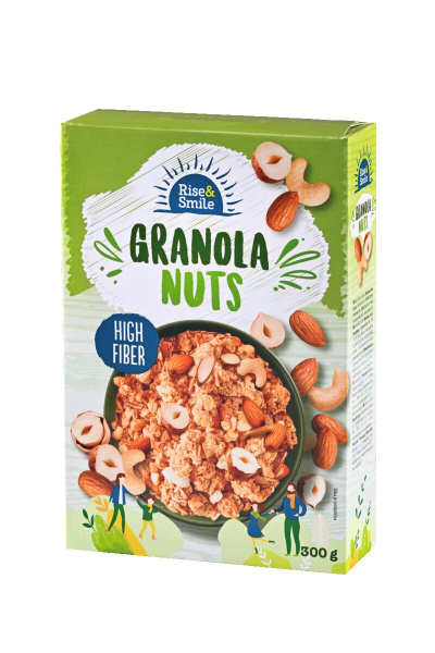 31,7 % polnozrnati OVSENI kosmiči, ekstrudirani izdelki iz žita (PŠENIČNA polnozrnata moka, koruzni zdrob, sladkor, PŠENIČNI otrobi, koruzni škrob, sol, emulgator: lecitini (sončnični); sončnično olje, izvleček JEČMENOVEGA slada), palmino olje, sladkor, glukozni sirup, 7 % mešanica OREŠKOV (INDIJSKI OREŠČKI, LEŠNIKI, MANDLJI), PŠENIČNI škrob, nariban kokos, karamelizirani sladkorni sirup, sol, aroma. Lahko vsebuje sledi ARAŠIDOV, SOJE, MLEKA, drugih OREŠKOV in SEZAMA.