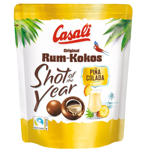sladkor, kakavovo maslo, polno mleko v prahu, kakavova masa, rum (5%), kokosova moka (4%), sladka sirotka v prahu, ovsena kaša, arome, zgoščeni ananasov sok v prahu (0,5%), emulgator: lecitini (soja); kislina: citronska kislina; sredstvi za glaziranje: gumi arabikum, šelak; glukozni-fruktozni sirup, želatina, škrob. Izdelek lahko vsebuje sledi oreškov. Vsebnost alkohola: 2,0%. ŽIVILO NI PRIMERNO ZA OTROKE.