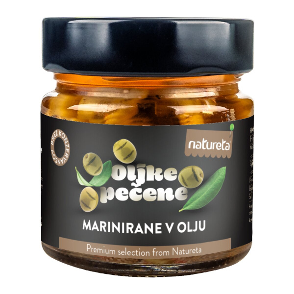 Zelene oljke, sončnično olje, jodirana sol (sol, kalijev jodid), česen, zelišča, sredstvo za uravnavanje kislosti: citronska kislina.