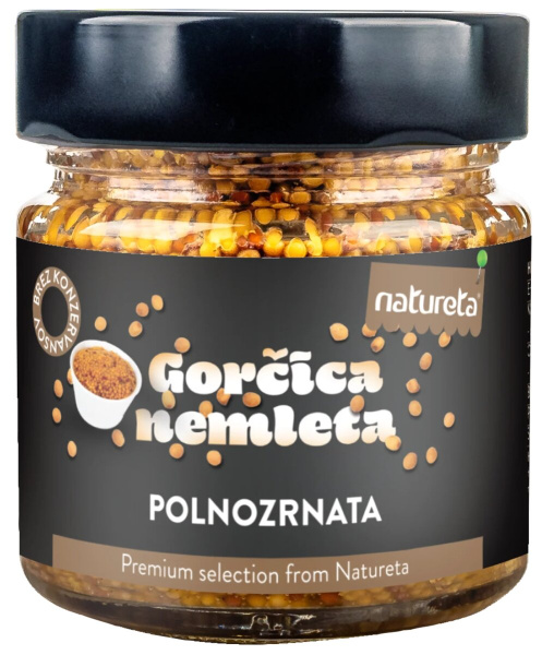 Voda, GORČIČNO SEME 33 %, alkoholni kis, jodirana sol (sol, kalijev jodid), vinski kis, sladkor, začimbe, naravna aroma, barvilo: riboflavini.