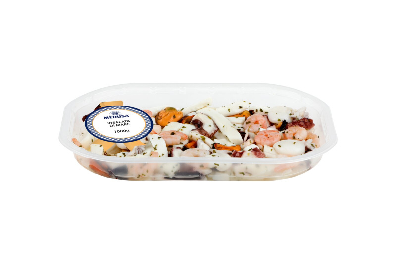 Pripravljena mešanica MEHKUŽCEV in RAKOV 59% (LIGNJI, KOZICE, ŠKOLJKE, HOBOTNICA, SIPA, vinski kis, sol, naravne arome, limonin sok, sredstvo za uravnavanje kislosti: citronska kislina, natrijevi citrati, konzervans: E202, antioksidant: L-askorbinska kislina), sončnično olje, peteršilj. Lahko vsebuje sledi RIB, GLUTENA, SOJE in JAJC.