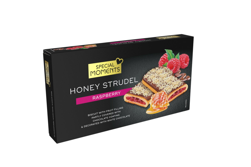 Piškoti (PŠENIČNA moka, sladkor, margarina (palmino olje, sončnično olje, voda, emulgator: mono- in digliceridi maščobnih kislin; sol, antioksidanti: citronska kislina, izvleček, bogat s tokoferolom, estri askorbinske kisline z maščobnimi kislinami; konzervans: kalijev sorbat; aroma, barvilo: karoteni), voda, sirup iz invertnega sladkorja, dekstroza, izvleček JEČMENOVEGA slada, JAJCA, SIROTKA v prahu, mešane začimbe, med 0,5 %, sredstvo za vzhajanje: amonijev hidrogenkarbonat, natrijev hidrogenkarbonat; jodirana sol (sol, kalijev jodid), manj masten kakavov prah, emulgatorja: lecitini, mono- in digliceridi maščobnih kislin), sadno polnilo z malinami 30 % (sladkor, voda, sadje 18 % (maline 10 %, jabolka 8 %), glukozni sirup, gostilo: pektin; sredstvo za uravnavanje kislosti: citronska kislina), čokoladni obliv 7 % (sladkor, kakavova masa, kakavovo maslo, popolnoma hidrogenirano palmina maščoba, emulgatorja: lecitini (SOJA), poliglicerol poliricinoleat; aroma), bela čokolada 7 %(sladkor, kakavovo maslo, posneto MLEKO v prahu, popolnoma hidrogenirano palmina maščoba, emulgatorja: lecitini (SOJA), poliglicerol poliricinoleat; aroma). Lahko vsebuje sledi OREŠKOV.