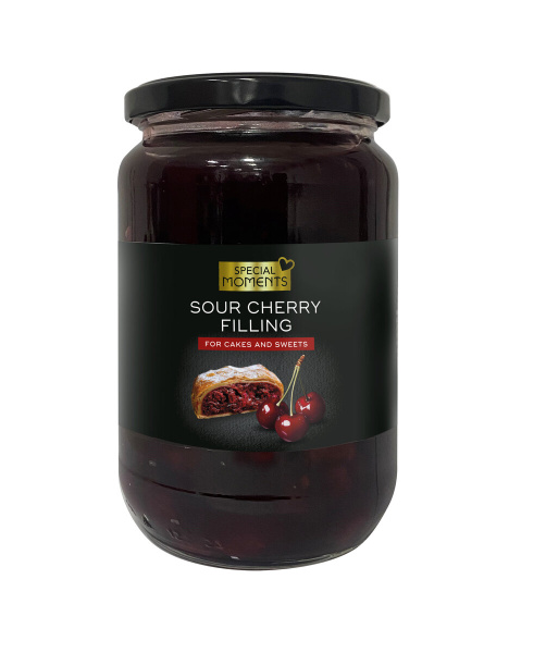 Višnje brez koščic (45 %), sladkor,modifcirani škrob, sredstvo za uravnavanje kislosti: citronska kislina; sol; konzervans: kalijev sorbat. Izdelek lahko vsebuje koščice ali dele koščic.