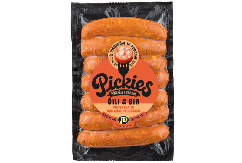 Poltrajna prekajena piščančja klobasica s sirom in čilijem, Pickies, pakirana, 370 g