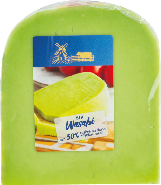 Pasterizirano kravje MLEKO, wasabi v prahu (hren v prahu, GORČICA v prahu, japonski wasabi), hren, GORČIČNO seme 2,5 %), sol, starter, mikrobiološko sirilo, aroma, barvilo: E141, izvleček kurkume. Ovoj sira vsebuje natamicin <1mg / dm^2. Skorja sira ni užitna.