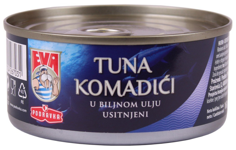 TUN (Thunnus albacares) 70 %, sončnično olje 29 %, kuhinjska sol.
