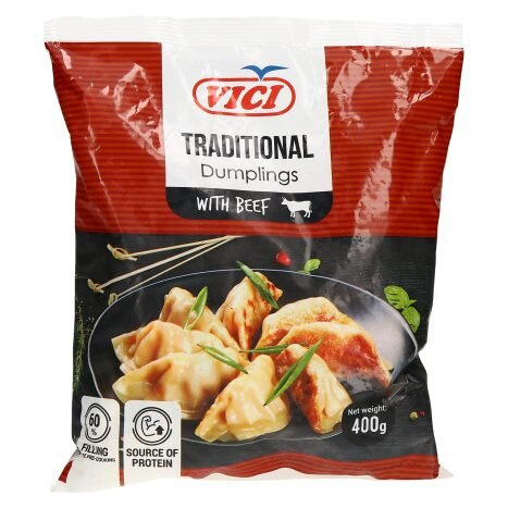 Nadev 60 %: goveje meso 36 %, goveji loj 19 %, voda, JAJČNI BELJAK, čebula, sol, mleti črni poper, korejski por, česnov granulat, začimbe (vsebujejo GORČICO). Testo 40 %: PŠENIČNA moka, voda, repično olje, sol. Lahko vsebuje sledi: RAKOV, RIB, SOJE, MLEKA/laktoze, ZELENE, SEZAMOVIH semen.