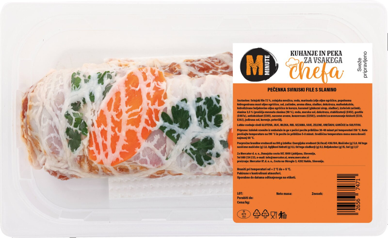 Svinjski file 72 %, svinjska mrežica, voda, marinada (olje oljne ogrščice, popolnoma hidrogenirana mast oljne ogrščice, sol, začimbe, aroma dima, sladkor, dekstroza, maltodekstrin, hidrolizirane beljakovine oljne ogrščice in koruze, karamel (glukozni sirup, sladkor), izvleček začimb), slanina 3,5 % (prašičja mesnata slanina (90 %), voda, morska sol, dekstroza, stabilizatorji (E451), gostilo (E407a), antioksidant (E301), naravne arome, konzervans (E250)), sredstvi za uravnavanje kislosti (E331, E262), jodirana sol, korenje, peteršilj. Lahko vsebuje sledi GLUTENA, JAJC, MLEKA, RIB, SEZAMA, SOJE, ZELENE, OREŠKOV, GORČICE in SULFITOV.