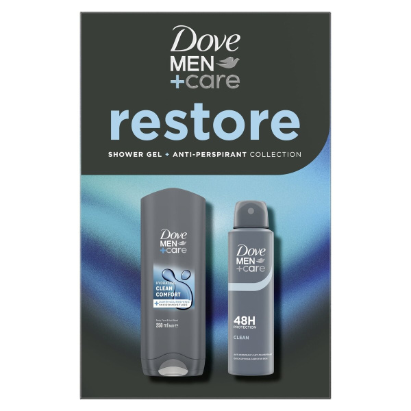 Dove Men+Care Clean Comfort gel za tuširanje za tijelo i lice: Aqua, Sodium Laureth Sulfate, Glycerin, Cocamidopropyl Betaine, Sodium Chloride, AcrylatesCopolymer, Sodium Lauroyl Isethionate, Parfum, Sodium Benzoate, Sodium Hydroxide, Stearic Acid, Lauric Acid, Palmitic Acid, Tetrasodium EDTA, SodiumIsethionate, Citric Acid, Hydroxystearic Acid, PPG-6, Alpha-Isomethyl Ionone, Benzyl Salicylate, Limonene, Linalool, CI 17200, CI 19140, CI 42090.Dove Men+Care Clean Comfort antiperspirant u spreju: Butane, Isobutane, Propane, Cyclopentasiloxane, PPG-14 Butyl Ether, Aluminum Sesquichlorohydrate, Parfum, Glycine, Helianthus Annuus Seed Oil, C12-15 Alkyl Benzoate, Disteardimonium Hectorite, Calcium Chloride, Octyldodecanol, BHT, Propylene Carbonate, Dimethiconol, Alpha-Isomethyl Ionone, Benzyl Alcohol, Citronellol, Coumarin, Hexyl Cinnamal, Limonene, Linalool.Nanašajte z razdalje 15 cm, počakajte, da se posuši. OPOZORILO: Ne nanašajte na poškodovano kožo. Prenehajte z uporabo, če sepojavi izpuščaj ali draženje. Izogibajte se neposrednemu vdihavanju. Nanašajte v krajših curkih v dobro prezračenem prostoru, izogibajte se pretiranemu nanosu. Ne pršite v bližini oči. Ni za uporabo v intimnem predelu. Uporabljajte le v skladu z navodili. Samo za zunanjo uporabo. NEVARNOST:Lahko vnetljiv aerosol. Posoda pod tlakom: lahko poči pri segrevanju. Hraniti ločeno od vročine, vročih površin, isker, odprtega ognja in drugih virov vžiga. Kajenje prepovedano. Ne pršite v odprt ogenj ali drug vir vžiga. Ne luknjajte ali sežigajte, tudi po uporabi. Zaščititi pred sončno svetlobo. Ne izpostavljajte temperaturam nad 50°C. Hraniti izven dosega otrok.