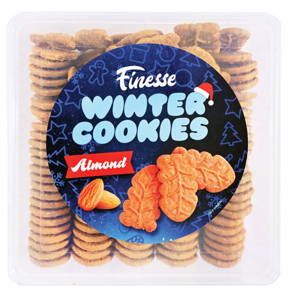 PŠENIČNA moka, sladkor, palmina maščoba, sesekljani MANDLJI 3 %, mleti MANDLJI 3 %, JAJCA, karamelizirani sladkorni sirup (glukozni sirup, sladkor), začimbe, sol, sredstvo za vzhajanje: natrijevi karbonati, amonijevi karbonati, kalijevi karbonati; kislina: citronska kislina; aroma. Lahko vsebuje sledi MLEKA in drugih OREŠKOV.