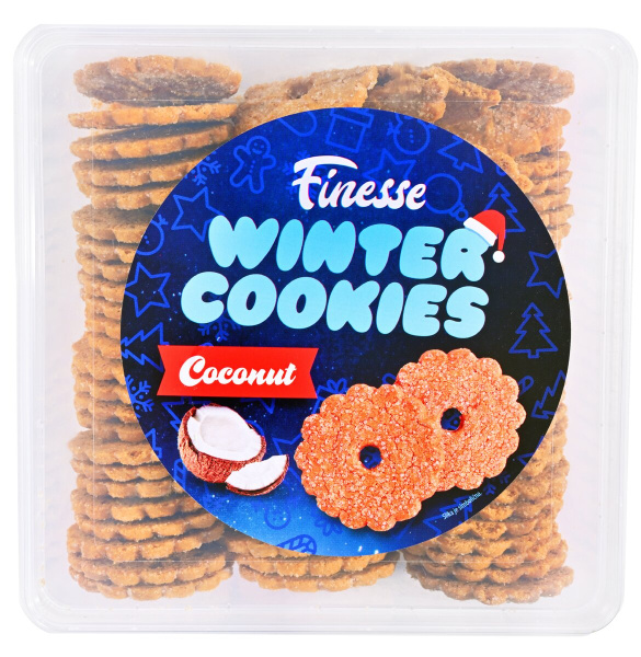 PŠENIČNA moka, sladkor, palmina maščoba, posušen kokos 6,5 %, JAJCA, karamelizirani sladkorni sirup (glukozni sirup, sladkor), začimbe, naravna aroma bourbonske vanilije, sol, sredstvo za vzhajanje: natrijevi karbonati, amonijevi karbonati, kalijevi karbonati; kislina: citronska kislina. Lahko vsebuje sledi MLEKA in OREŠKOV.