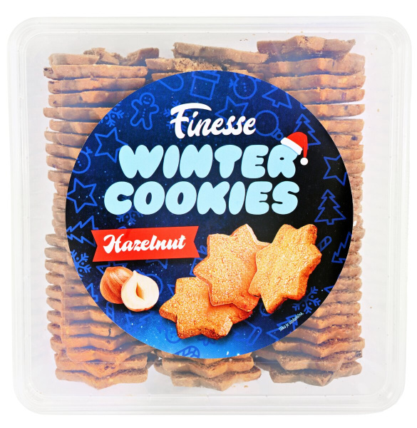 PŠENIČNA moka, sladkor, palmina maščoba, sesekljani LEŠNIKI 7 %, čokoladni koščki (kakavova masa, sladkor, kakavov prah, kakavovo maslo, emulgator: lecitini (SOJA)), JAJCA, karamelizirani sladkorni sirup (glukozni sirup, sladkor), cimet, sol, sredstvo za vzhajanje: natrijevi karbonati, amonijevi karbonati, kalijevi karbonati; kislina: citronska kislina. Lahko vsebuje sledi MLEKA.
