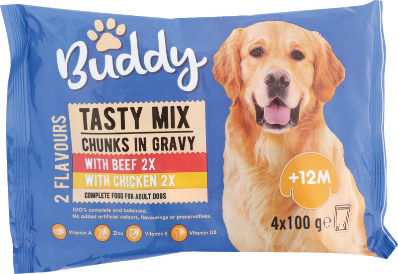 Mokra hrana za odrasle pse, mix 2 okusa, Buddy, 4 x 100 g