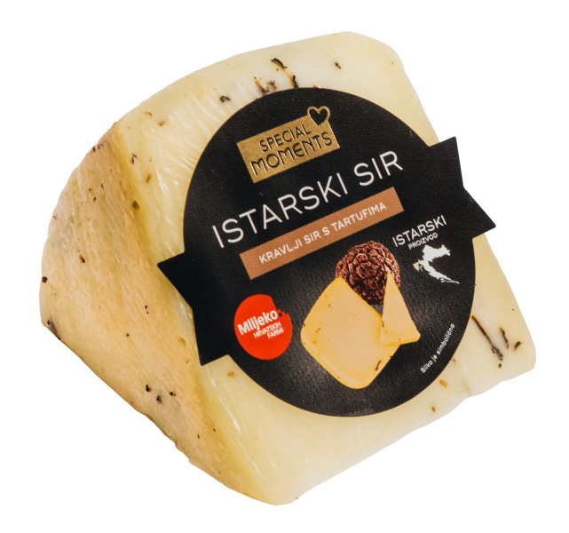 Pasterizirano polno MLEKO, mikrobiološke kulture, sirilo mikrobnega izvora, kalcijev klorid, jodirana sol (kalijev jodad), konzervans: lizocim (iz JAJC), utrjevalec: kalcijev klorid, črni tartuf 2 % (Tuber aestivum), oljčno olje z okusom belih tartufov 0,2 %. Vakuumsko pakirano.