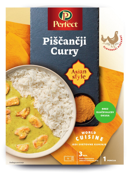 Meso v omaki 57 %: piščančje meso 56 %, voda, jogurt (MLEKO), čebula, kokosovo mleko (kokosov ekstrakt, voda, stabilizator: guar gumi), sladka SMETANA (MLEKO), začimbe, sončnično olje, škrob, piščančja jušna osnova, jodirana sol, paradižnikov koncentrat. Kuhan riž 43 %: voda, riž, sončnično olje, sredstvo za uravnavanje kislosti: pufrirani kis, jodirana sol.