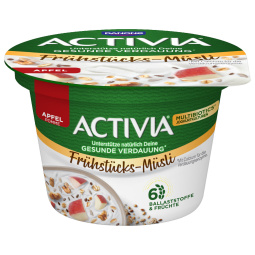 Rdeče sadje: Posneto MLEKO, voda, SMETANA, sladkor, 2,7 % jabolko, oligofruktoza, 1,5 % črni ribez, 1,2 % jagoda, 1,2 % sončnična semena, 1,1 % JEČMEN, 0,9 % OVES, 0,4 % borovnice, 0,2 % LANENO seme, MLEČNE beljakovine, posneto MLEKO v prahu, modificiran škrob, koncentrat limoninega soka, barvilo koncentrat korenčkovega in grozdnega soka, zgoščevalec pektini, naravna aroma, jogurtove kulture (S. thermophilus, L. bulgaricus, L. lactis). Z bifidus kulturo ActiRegularis. Jabolko: Posneto MLEKO, voda, SMETANA, 6 % jabolko, sladkor, oligofruktoza, 1,2 % JEČMEN, 1,1 % OVES, 1,1 % sončnična semena, 0,5 % OREHI, 0,3 % bučna semena, 0,2 % LANENO seme, MLEČNE beljakovine, posneto MLEKO v prahu, modificiran škrob, koncentrat limoninega soka, barvilo karameliziran sladkorni sirup, zgoščevalec pektini, naravna aroma, jogurtove kulture (S. thermophilus, L. bulgaricus, L. lactis). Z bifidus kulturo ActiRegularis.