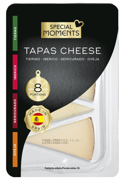 TIERINO, MEŠANI SIR- Sestavine: pasterizirano MLEKO 80 %, pasterizirano ovčje MLEKO 5 %, sol, sirilo mikrobnega izvora, mikrobiološke kulture. SEMICURADO, MEŠANI ZORJEN SIR. Sestavine: pasterizirano MLEKO 80 %, pasterizirano ovčje MLEKO 5 %, sol, sirilo mikrobnega izvora, mikrobiološke kulture, konzervansa: kalijev sorbat*, natamicin*; barvilo: železovi oksidi in hidroksidi*. SIR IBERICO. Sestavine: surovo MLEKO 50 %, surovo ovčje MLEKO 15 %, surovo kozje MLEKO 15 %, sol, sirilo, mikrobiološke kulture, konzervansa: kalijev sorbat*, natamicin*; barvilo: železovi oksidi in hidroksidi*. OVEJA, OVČJI SIR. Sestavine: surovo ovčje MLEKO 98 %, sol, sirilo, mikrobiološke kulture, konzervansa: kalijev sorbat*, natamicin*; barvilo: železovi oksidi in hidroksidi*. *v skorji. Skorja ni užitna! Pakirano v kontrolirani atmosferi.